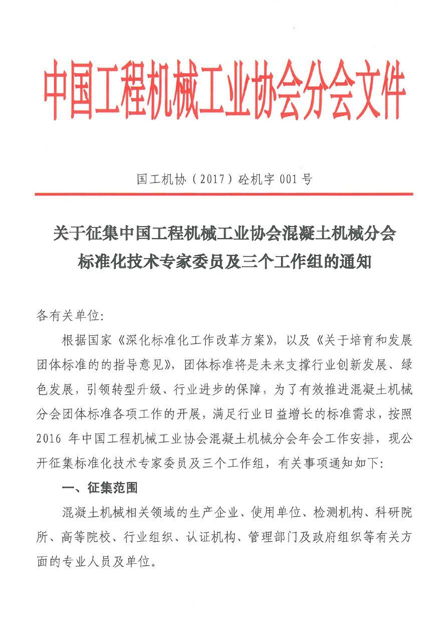 關于征集中國工程機械工業協會混凝土機械分會標準化技術專家委員及三個工作組的通知