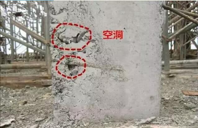 由于混凝土灌注時有一些部位堵塞不通,構件中就會產生空洞,空洞不同與蜂窩,蜂窩的特征是存在于未搗實的混凝土或缺水泥漿;而空洞卻是局部或全部沒有混凝土。空洞的尺度通常較大,以至于鋼筋全部裸露,造成構件內貫通的斷缺以至于結構發生整體性破壞。