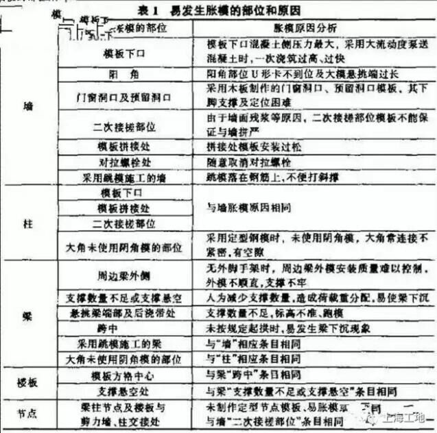 1 模板脹模問題引起的混凝土質量缺陷現象、發生的部位及原因:
