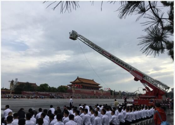此外,為滿足各種拍攝條件,央視還精選了中聯(lián)重科56米泵車和32米云梯消防車。56米泵車可謂是大號“攝像搖臂”,在其臂架前端架設(shè)攝像機輔助拍攝閱兵隊伍行進的動態(tài)長鏡頭。32米云梯消防車則是超高的“拍攝平臺”,央視的“長頸鹿攝像機”架設(shè)在高度32米的消防平臺上,攝像師站在平臺上捕捉受閱裝備彎道轉(zhuǎn)彎的精彩畫面,體現(xiàn)鋼鐵洪流卷起滾滾烽煙。在前期,云梯消防車還承擔(dān)了輔助架設(shè)“天鷹”的重任。