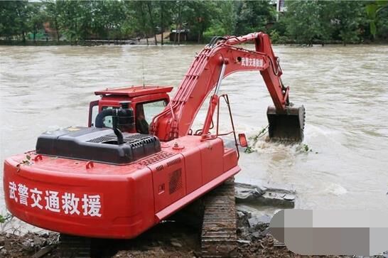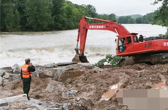 裝載機和挖掘機不停挖土并傾倒在河床上,山頂滑下來的巨石被填筑在路基邊坡,加固道路,保障安全,推土機在后方盡量推平直到可以供車輛行人行走,這是一幅抗洪救災現場最常見的畫面,通力合作的除了武警官兵和救援人員們,就屬這些工程機械設備最為搶眼了。