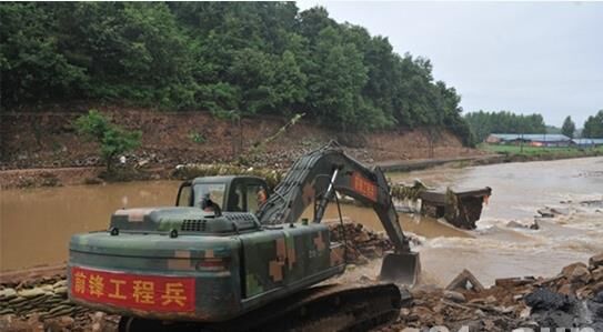 6月19日凌晨3時至20日8時,湖北黃岡地區發生百年不遇特大暴雨,并引發山體滑坡,導致多處道路損毀,其中蘄春縣張榜鎮災情最重。武警交通六支隊出動兵力100余人,動力舟橋、沖鋒舟和挖掘機等大型機車裝備近30臺(套),迅速展開救援工作。7月5日10時,在蘄春縣下蘄線牛皮坳段,一處550米長的堤岸上,11臺挖掘機一字排開,揮舞著大臂,將一鏟鏟砂石放下、夯實,對大堤進行加高。公路上,大型運輸車來回穿梭。附近的三處取土點,另外6臺挖掘機正在奮力勞作。從7月4日6時至7月6日18時,17臺挖掘機不間斷勞作,550米長、5米寬的堤岸,“長高”了近2米。