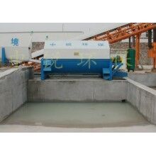 該系統(tǒng)主要由:攪拌車加水清洗裝置,溜槽輸送裝置,砂石漿水分離裝置,和泥漿水后處理裝置組成。混凝土輸送設(shè)備清洗后,將殘余混凝土排入溜槽中,在高壓水流沖擊下,經(jīng)溜槽進入砂石分離機,在不斷旋轉(zhuǎn)的分離機作用下,對混凝土進行充分的清洗,同時將砂、石進行分離,分離后的砂、石在導(dǎo)料葉片的作用下背向流動,再通過提升式出料口排出分離機,分別堆放。清洗后的漿水從分離機的底部排出進入沉淀池逐級沉淀后循環(huán)使用或進入攪拌池回收利用。進入攪拌池(一般情況2個攪拌池)的漿水為了防止沉淀凝固,需通過攪拌器的作用,攪拌器的工作為間歇式。分離出水泥漿在連續(xù)的攪拌器作用下,再通過高壓污水泵輸送到攪拌樓中待生產(chǎn)計量再利用。整個控制系統(tǒng)設(shè)有手動和自動控制,方便控制設(shè)置,整個系統(tǒng)運行可靠,故障率低,維護量少等特點。
