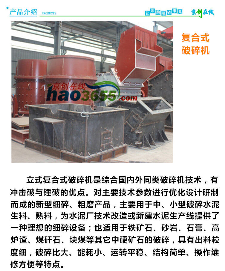 復合式破碎機800簡稱為復合破,是破碎生產線和制砂生產線中常用設備之一。復合破碎機是一種無篩條、可調式細碎設備,可廣泛適用于水泥廠的生料、熟料細碎作業,同時也可用于白云石、焦寶石、鉛鋅礦、蛇紋石、高爐渣、煤矸石、磷礦石等中等硬度物料的細碎作業,特別適用于硬質石灰巖、白云巖、花崗巖、玄武巖等人工造砂或高速公路路面石料的加工破碎。
