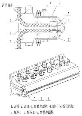 鋁合金夾具,夾具采用綜合性強的鋁,此材料柔韌性,剛性,抗沖擊性,拉斷性是綜合指數(shù)高的一種材料海順德橡膠是國內(nèi)最早研制鋼絲繩芯提升帶的專業(yè)生產(chǎn)廠家.